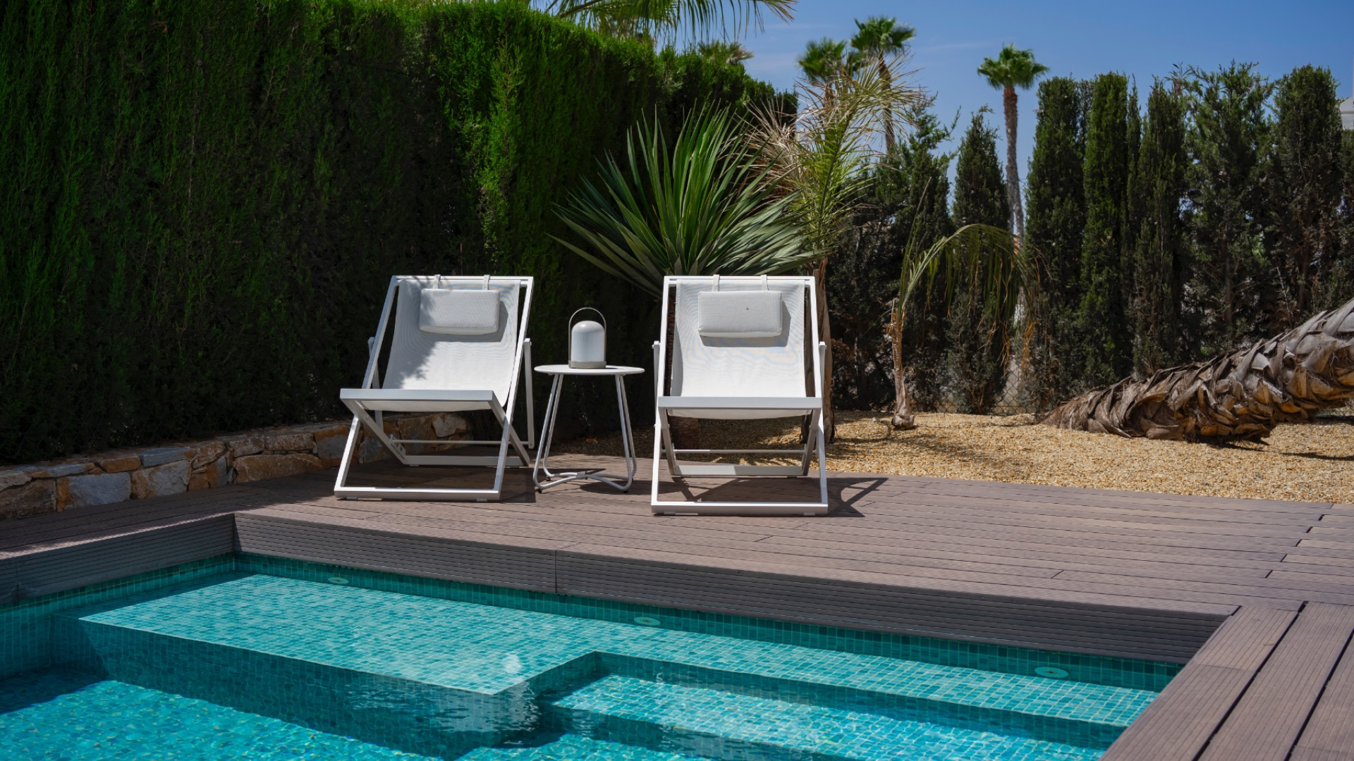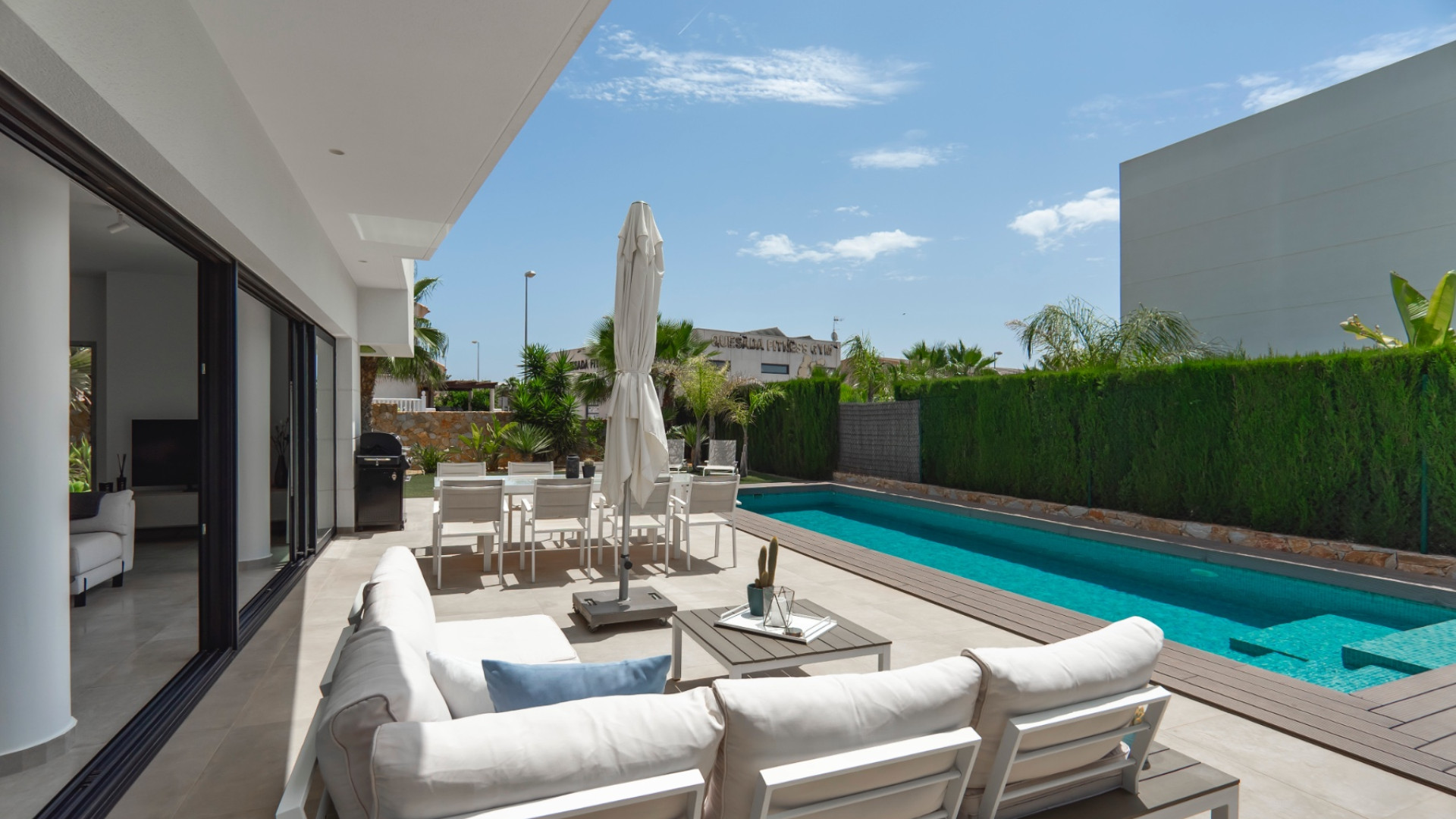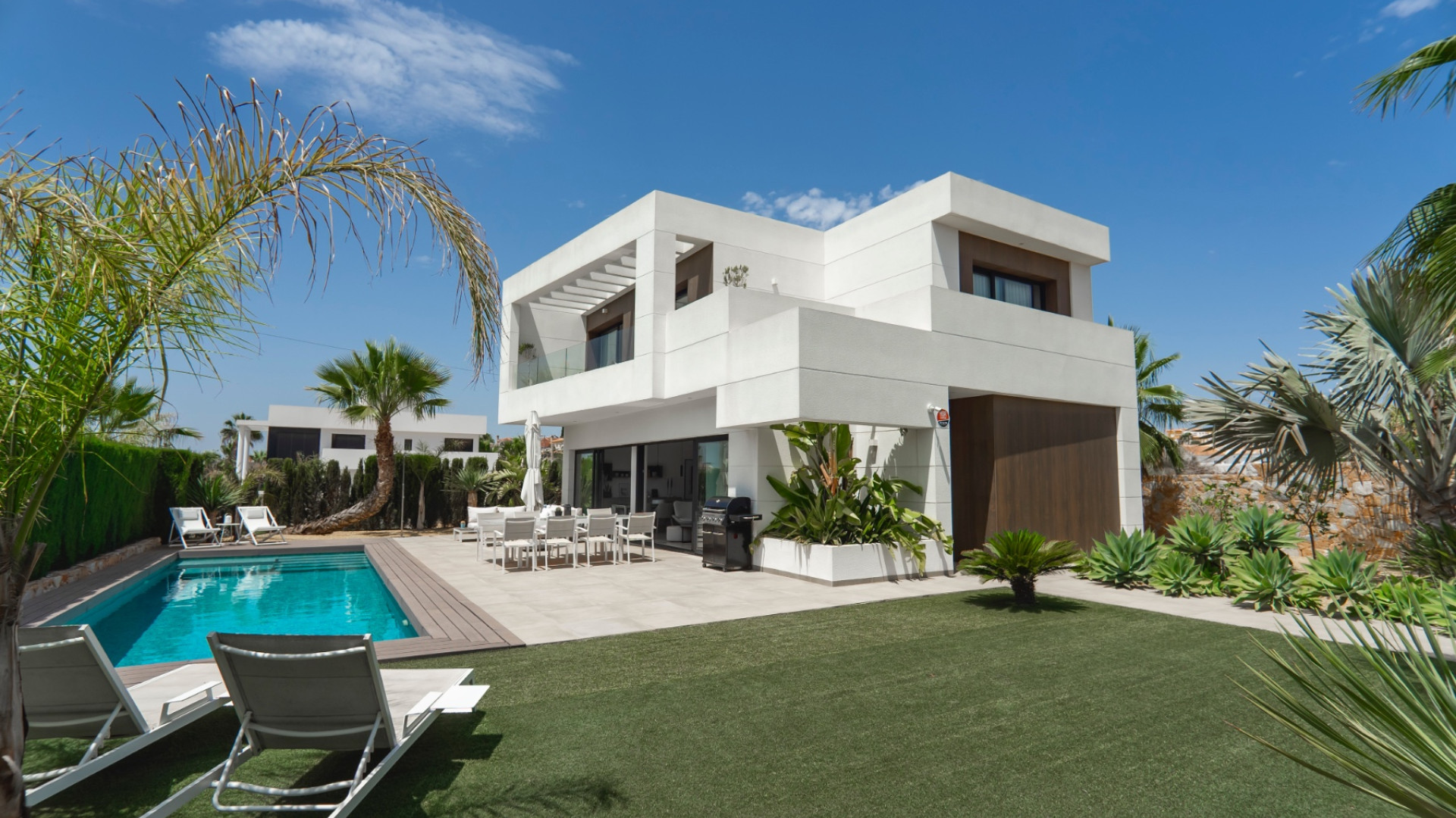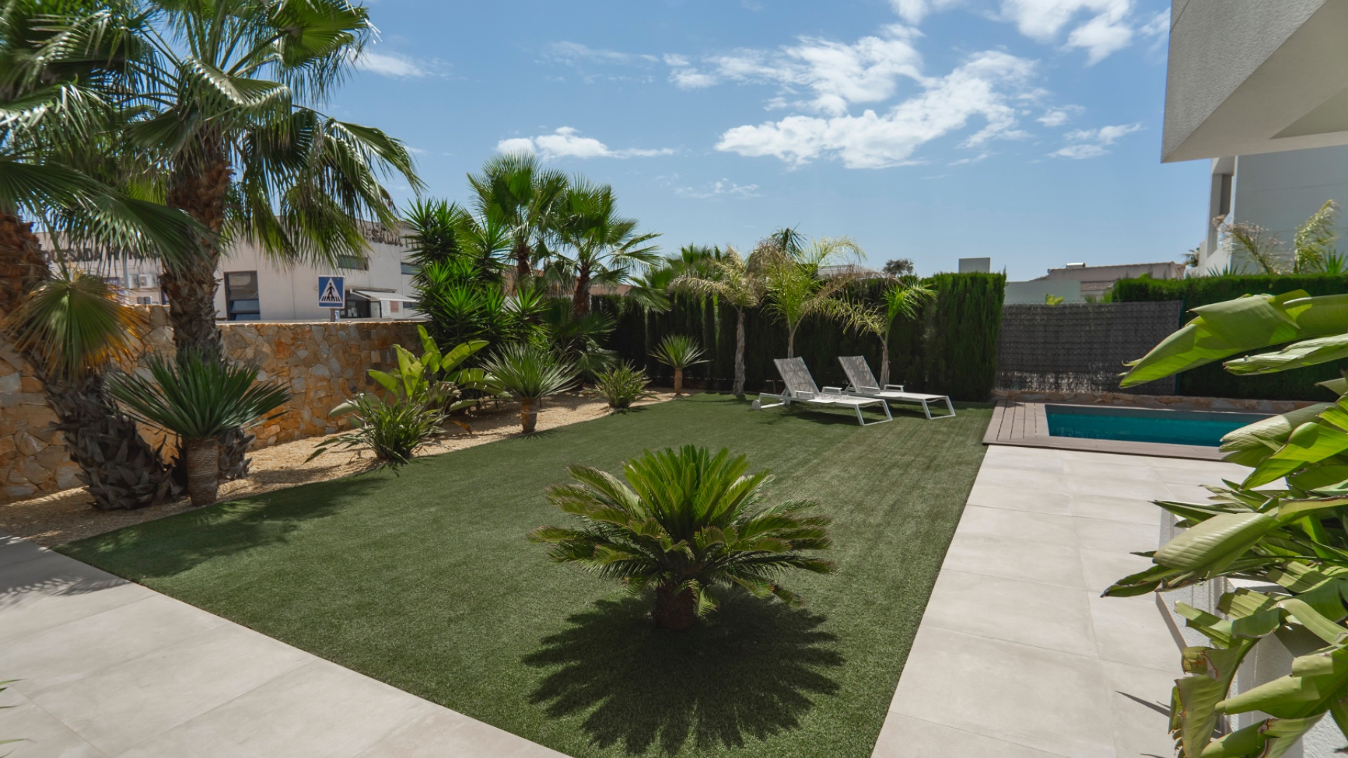 El hermoso jardín combina zonas de baldosas y césped artificial, rodeado de palmeras maduras y arriates de abetos . Disfrute de la piscina privada de 10 x 4 metros , preinstalada para climatizar, ideal para usar durante todo el año. La propiedad también cuenta con aparcamiento vigilado fuera de la carretera .