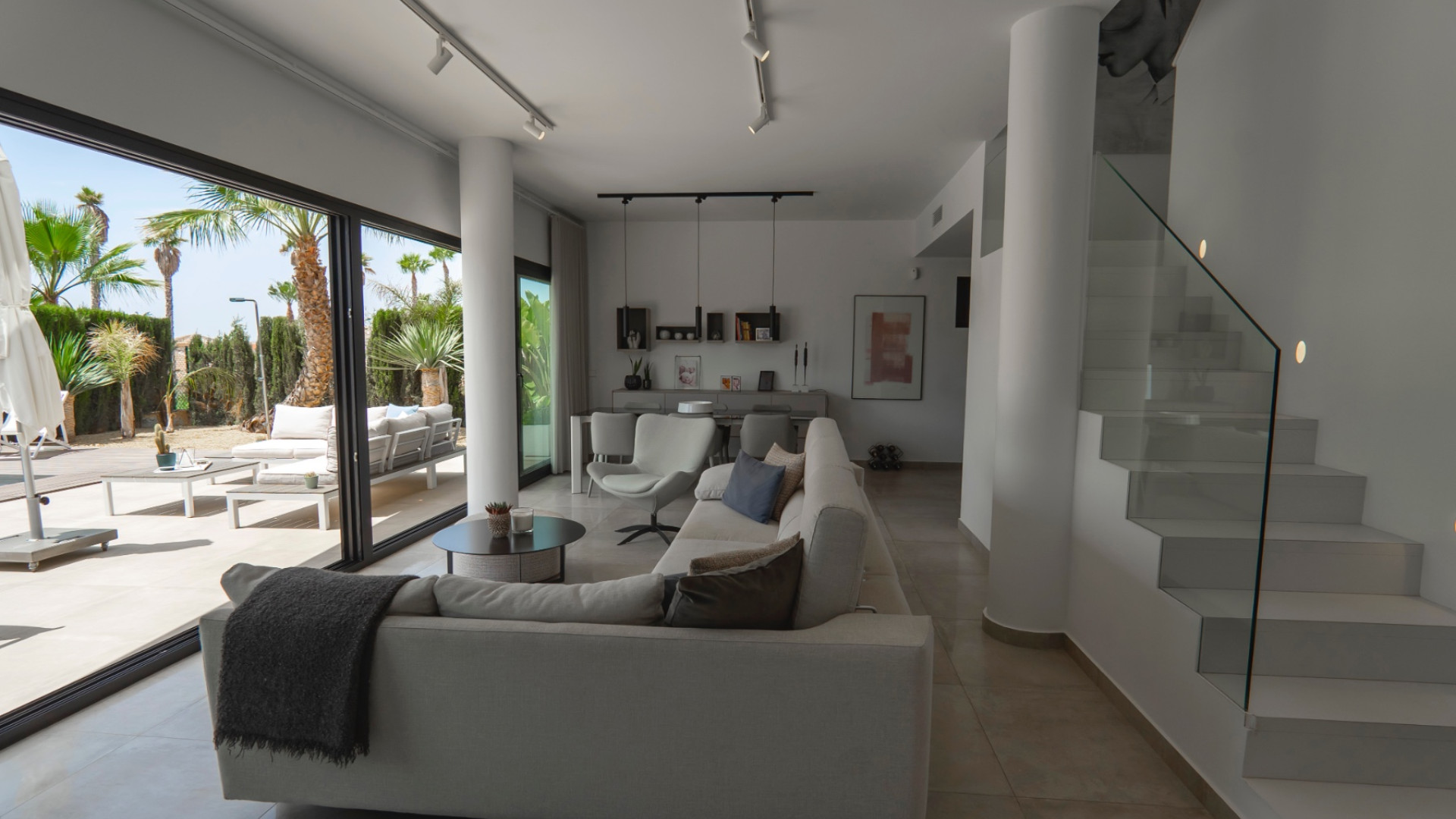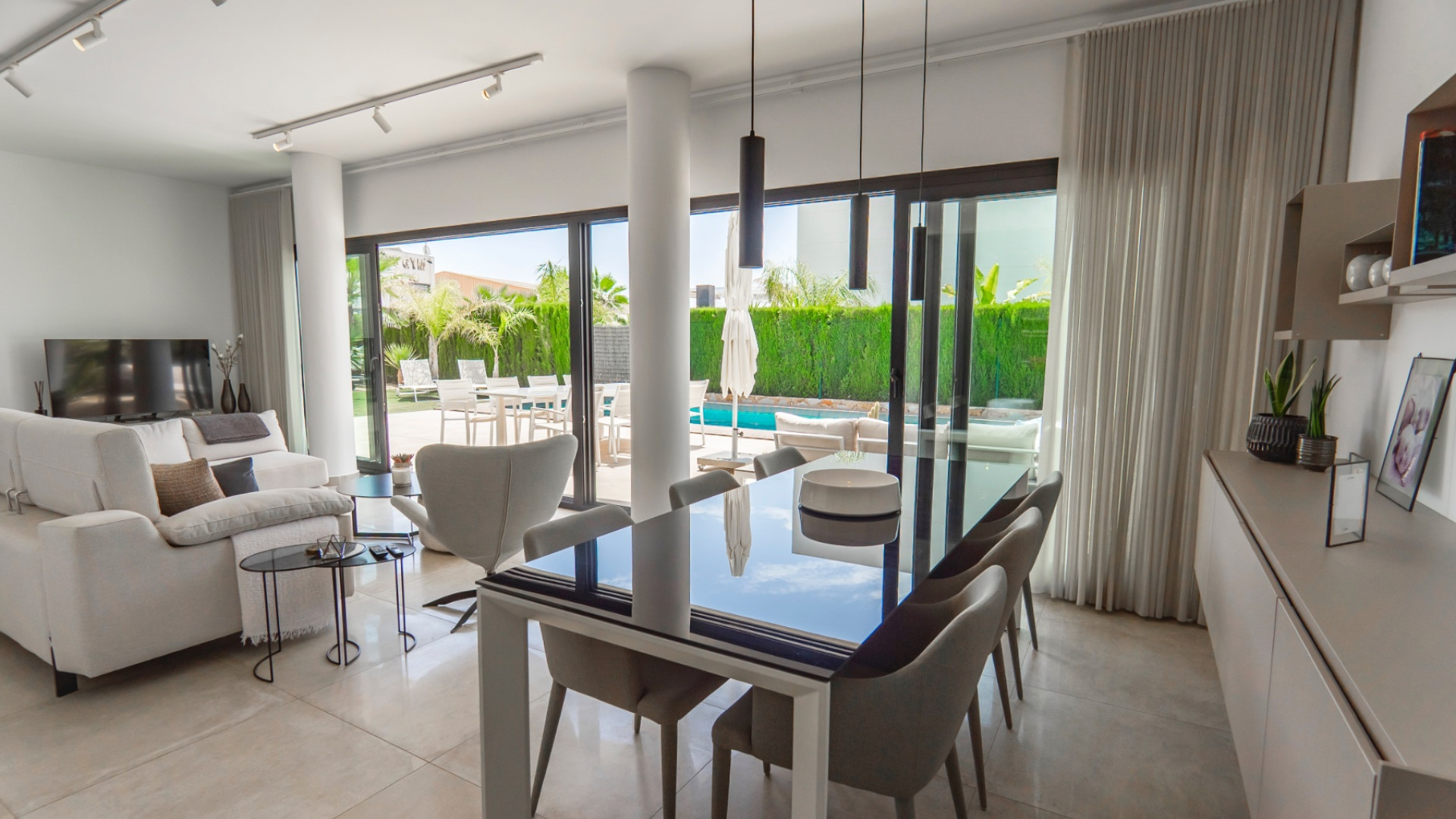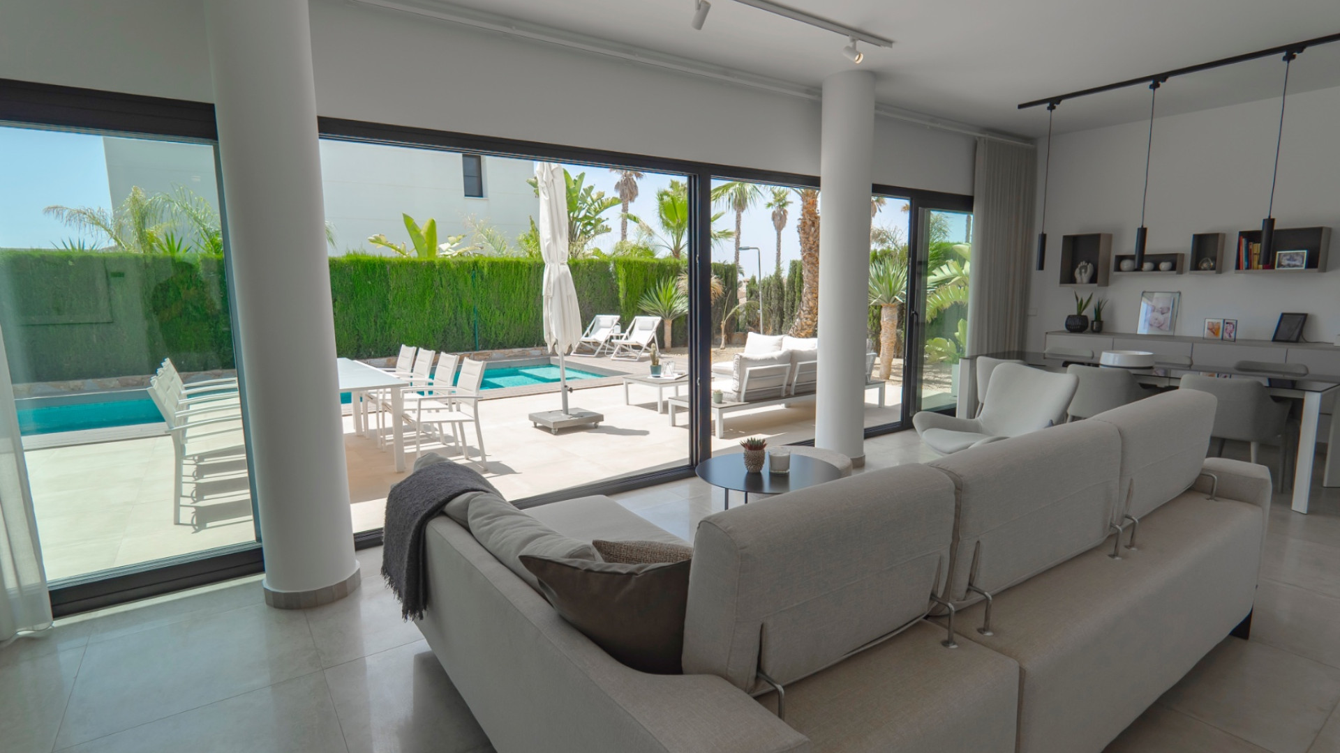 La luminosa y espaciosa sala de estar y comedor de planta abierta está inundada de luz natural gracias a las amplias puertas correderas acristaladas que dan directamente al jardín privado y a la piscina . La cocina moderna cuenta con electrodomésticos de alta gama, una elegante barra de desayuno y un lavadero independiente para mayor comodidad.