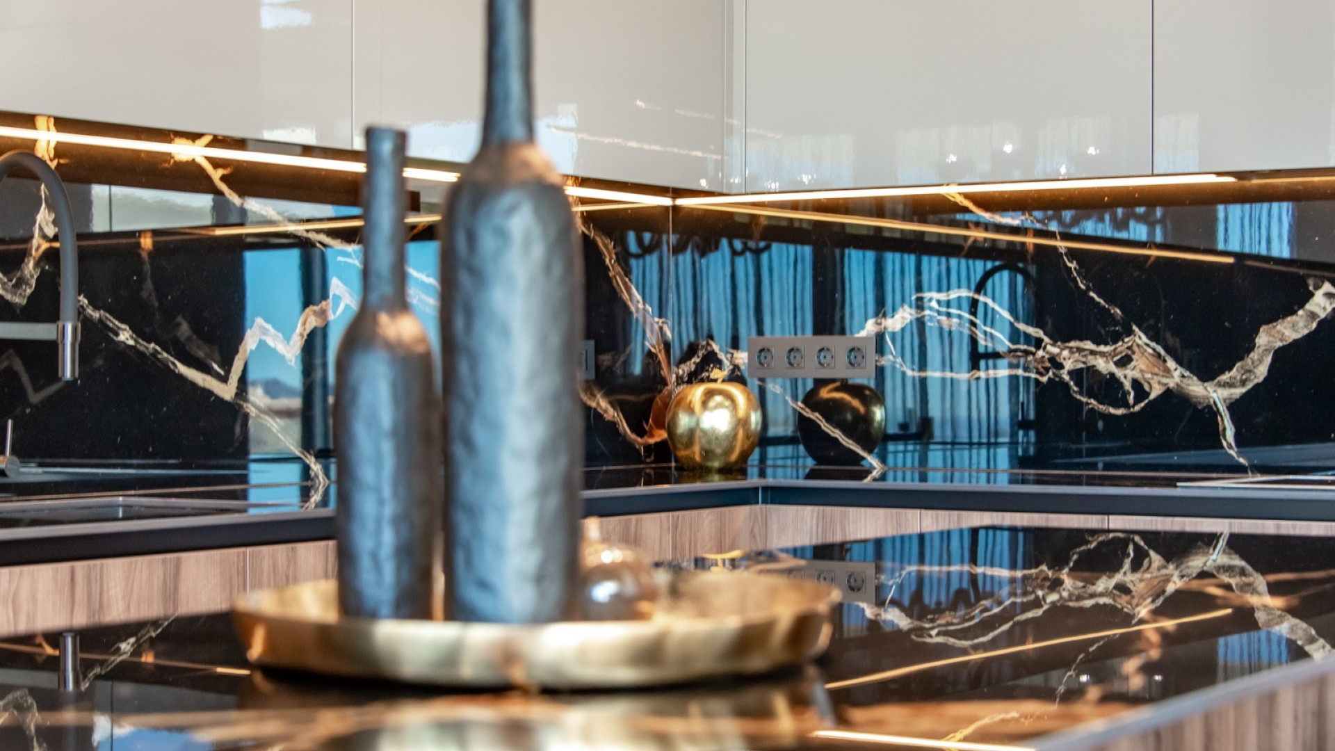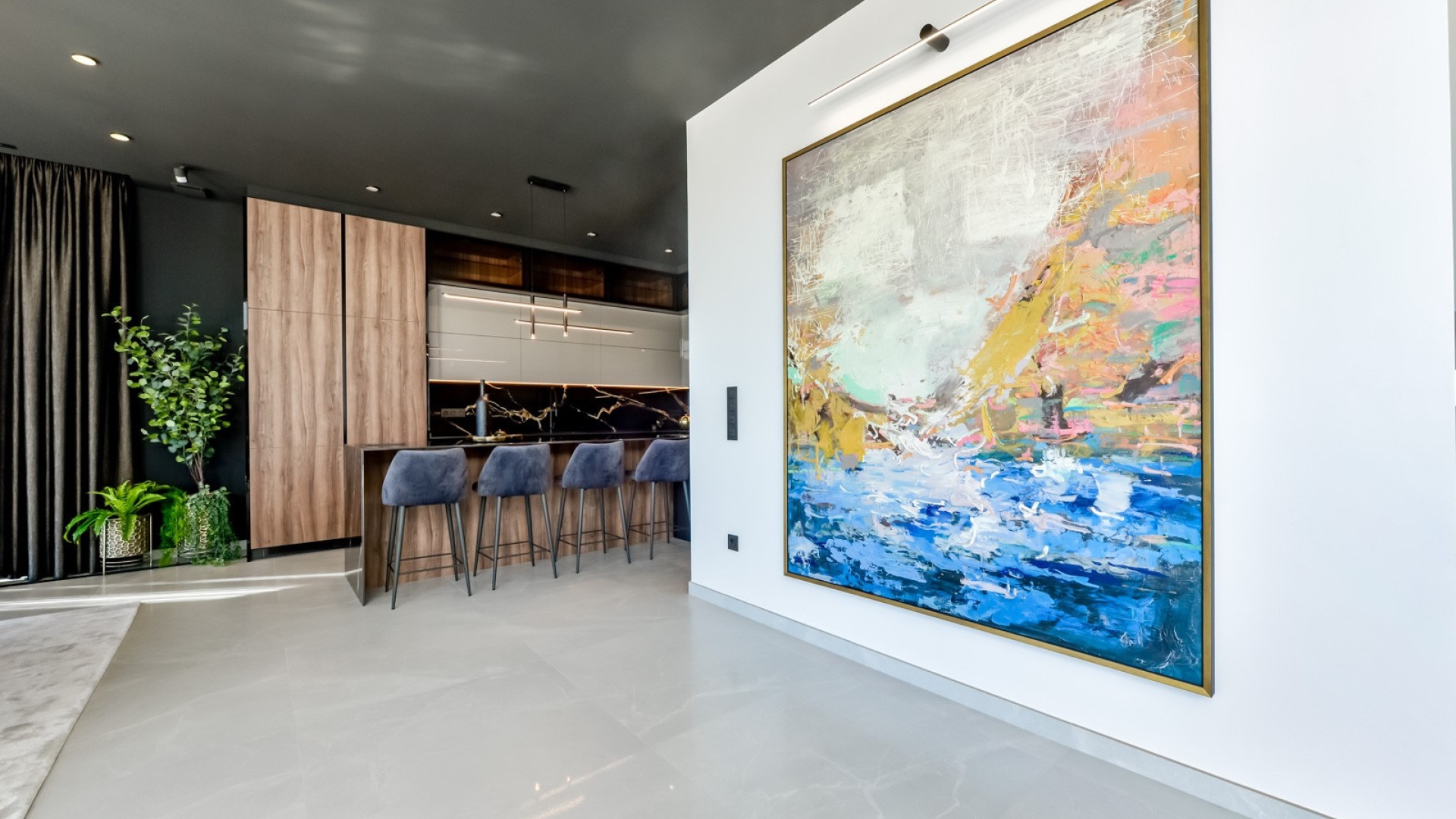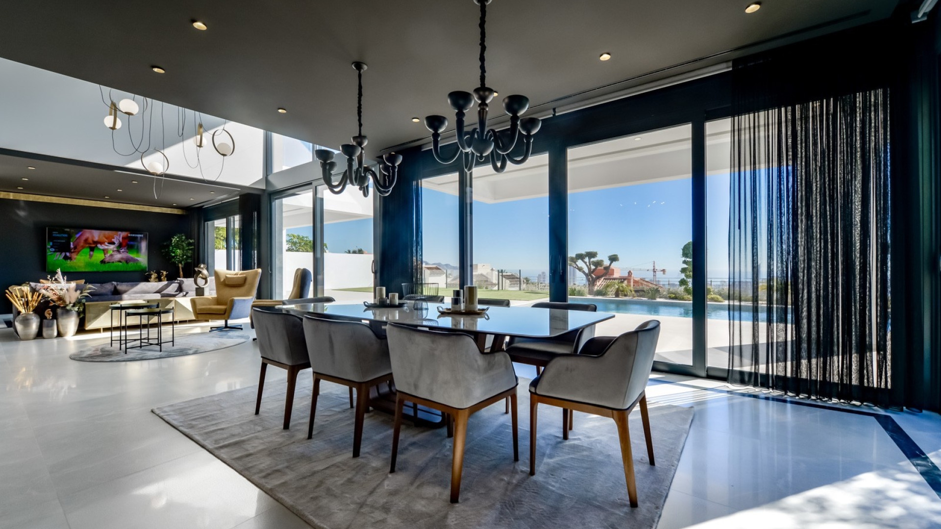 Par des portes coulissantes panoramiques, vous accédez à un magnifique séjour ouvert. Grâce à ses impressionnantes doubles hauteurs sous plafond et à ses baies vitrées qui encadrent la vue, la sensation d'espace et de luminosité est immédiatement palpable. Une élégante cuisine en marbre avec îlot central s'intègre harmonieusement à la salle à manger, idéale pour des repas en famille conviviaux et des réunions raffinées. Des toilettes invités se trouvent à proximité. Un coin salon confortable et élégant sépare discrètement la salle à manger du séjour, où la vue est omniprésente.