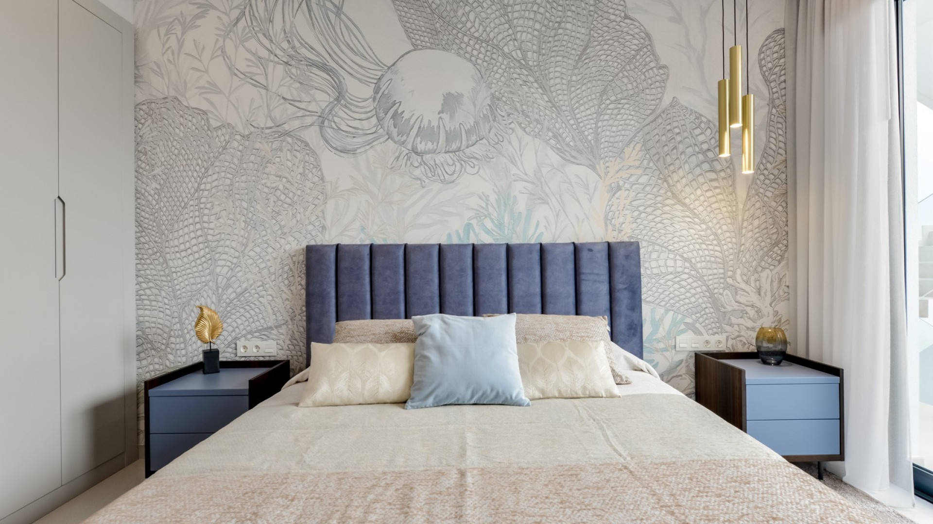 Prenez l'ascenseur jusqu'à l'étage et profitez d'une vue imprenable. La suite parentale, véritable oasis de tranquillité, dispose d'un dressing, d'une luxueuse salle de bains double et d'un accès à une spectaculaire terrasse panoramique offrant une vue panoramique sur la mer et les montagnes. La deuxième chambre dispose également d'une salle de bains attenante, de placards intégrés et d'une terrasse privée. La troisième chambre, à l'étage, est spacieuse et lumineuse et dispose d'une salle de bains familiale séparée.