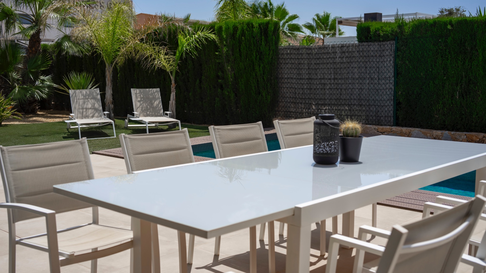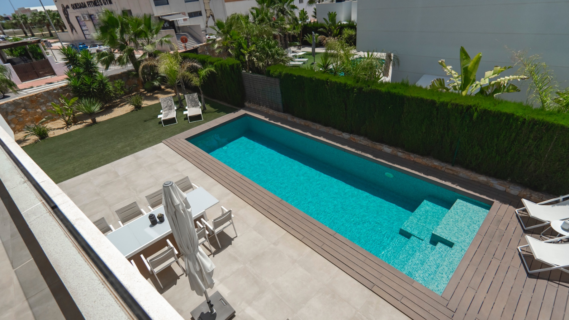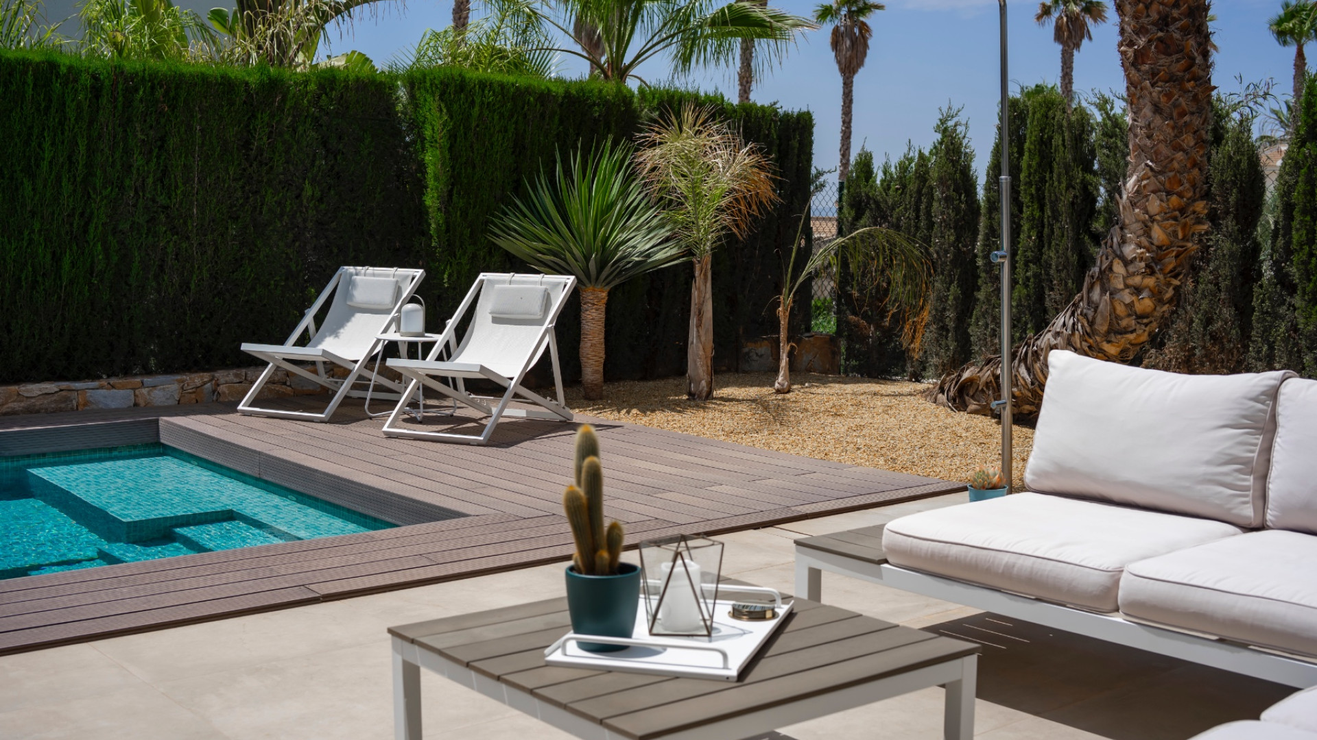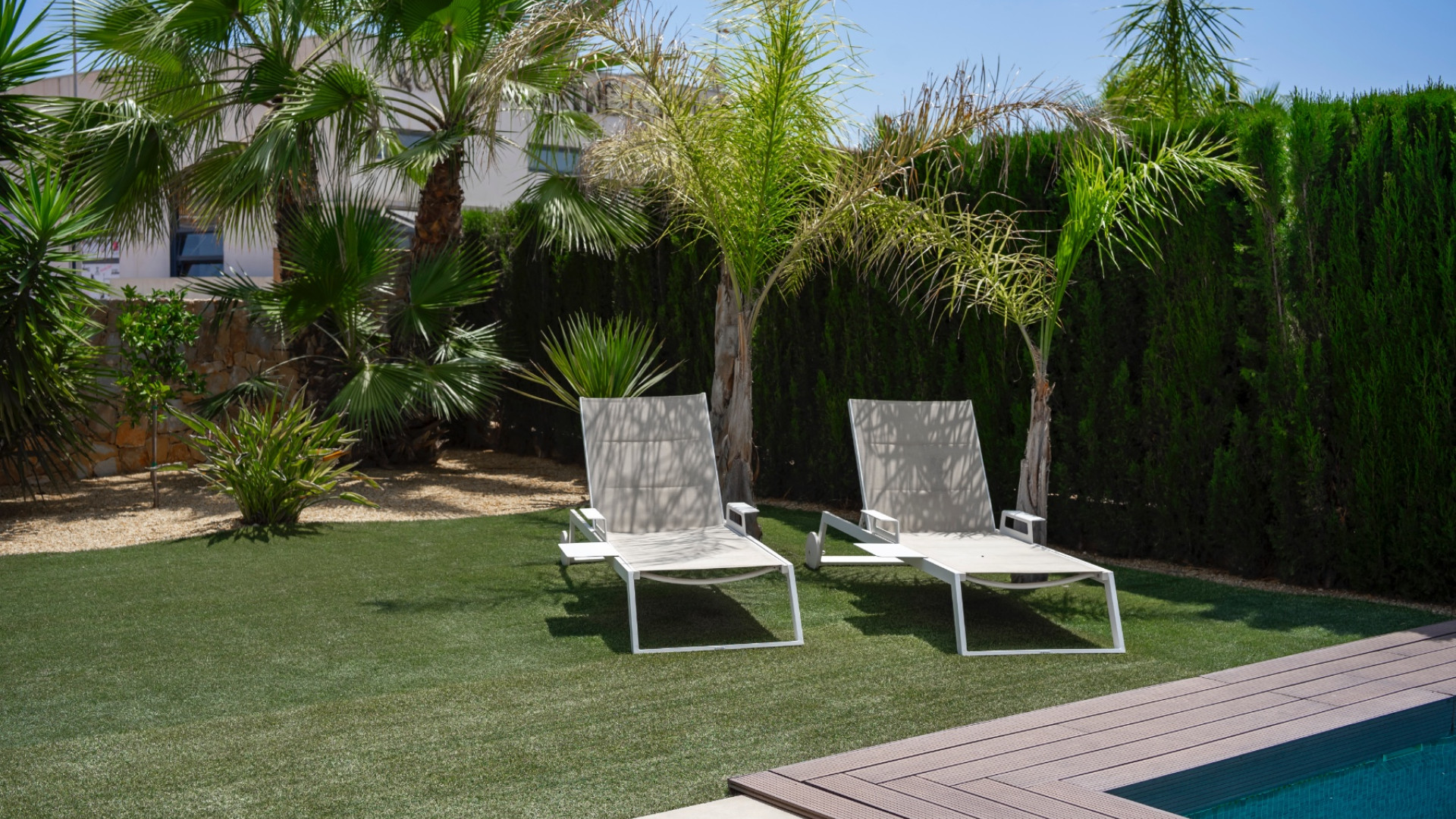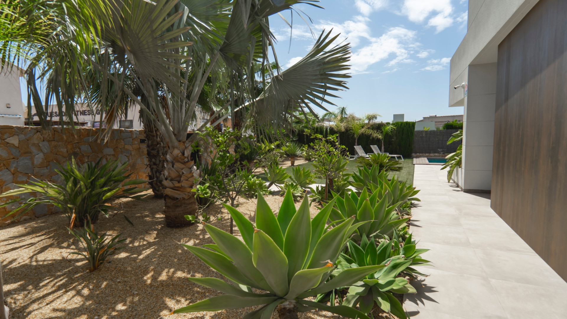 Le magnifique jardin allie espaces carrelés et gazon artificiel, et est entouré de palmiers et de sapins . Profitez de la piscine privée de 10 x 4 mètres , préchauffée et accessible toute l'année. La propriété dispose également d' un parking sécurisé .