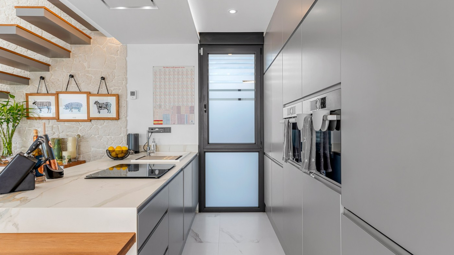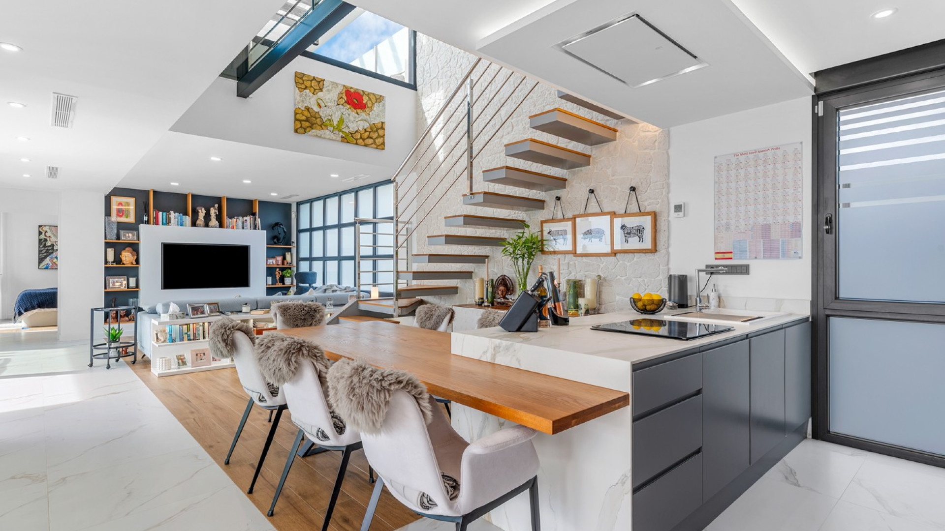Вилла занимает два этажа и спроектирована таким образом, чтобы максимально использовать естественное освещение, обеспечить плавные переходы между комнатами и гарантировать оптимальную функциональность. Прихожая разделяет основные жилые зоны и ведет в открытое пространство, включающее гостиную, столовую и кухню. Кухня оборудована изготовленной на заказ мебелью, современной отделкой и большими окнами с видом на садовые террасы и бассейн. Роскошная кухня оснащена высококачественной бытовой техникой Bosch и встроенным обеденным столом, за которым может разместиться вся семья.